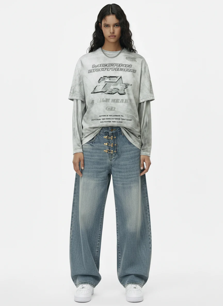 • Detail Features: Crew Neck, Short Sleeves, Graphic Print, Double Layer Design